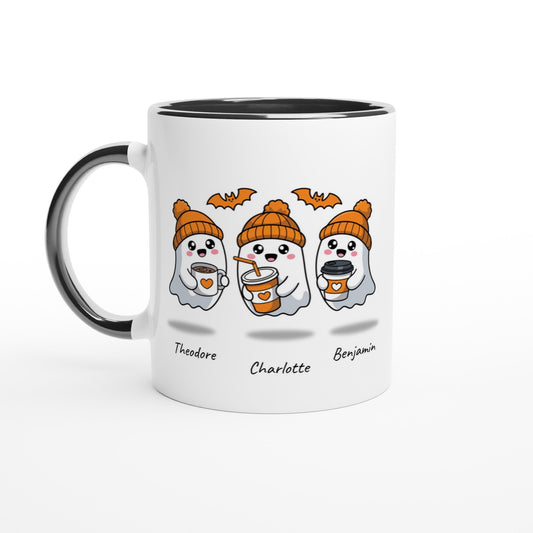Personalized Ghost Family Mug – 3 Cute Ghosts with Orange Hats & Bats, Custom Name Halloween Mug, 11oz Ceramic Cup